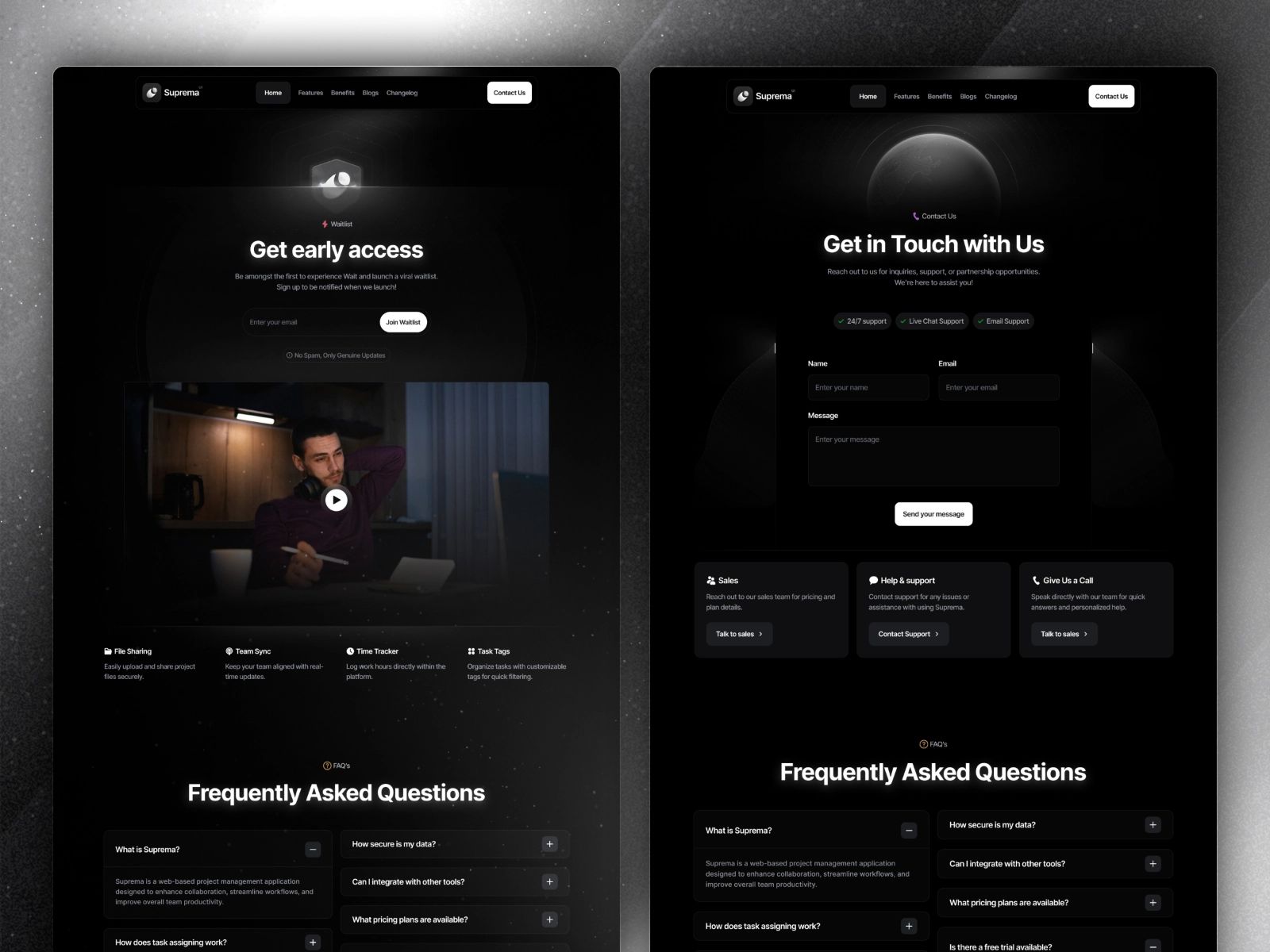 Choose this if: You're launching a dark-aesthetic SaaS or desktop/mobile app and need a fast, polished landing page with app distribution built in.