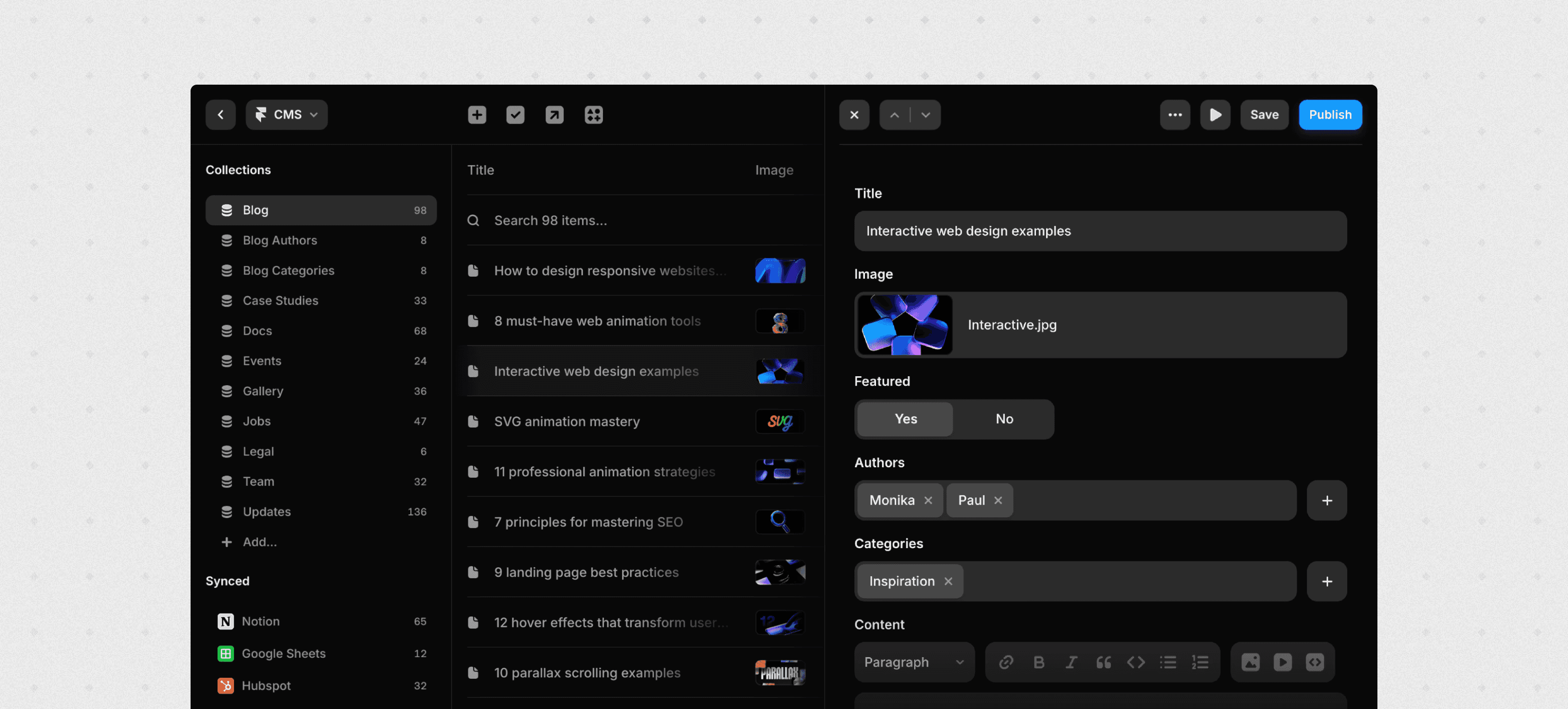 Think of it this way: Framer is exceptional for the front stage of your brand, the surfaces your customers and prospects see and interact with. For the heavy back-office content workflows and data management, use specialized tools.