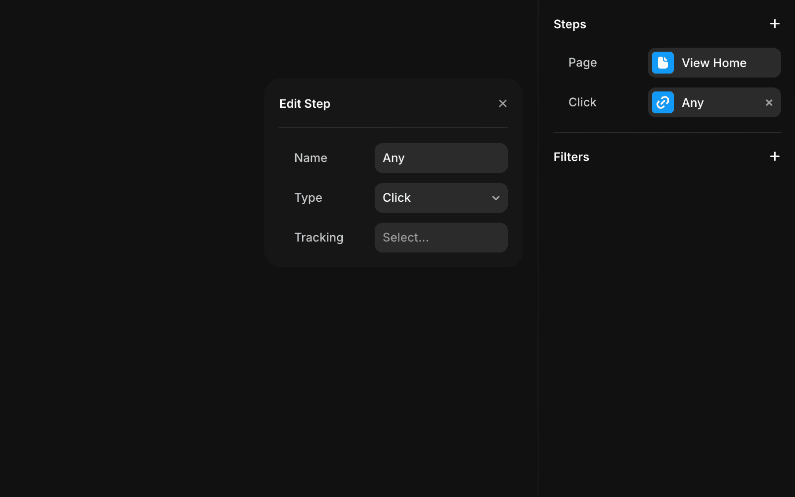Click the Configure button on the A/B test banner at the top of your editor. This opens the Analytics tab. Click the + icon next to "Steps" and select the tracking event you just created as your conversion step. You can add multiple steps, but the last step is what Framer uses to calculate the conversion rate.