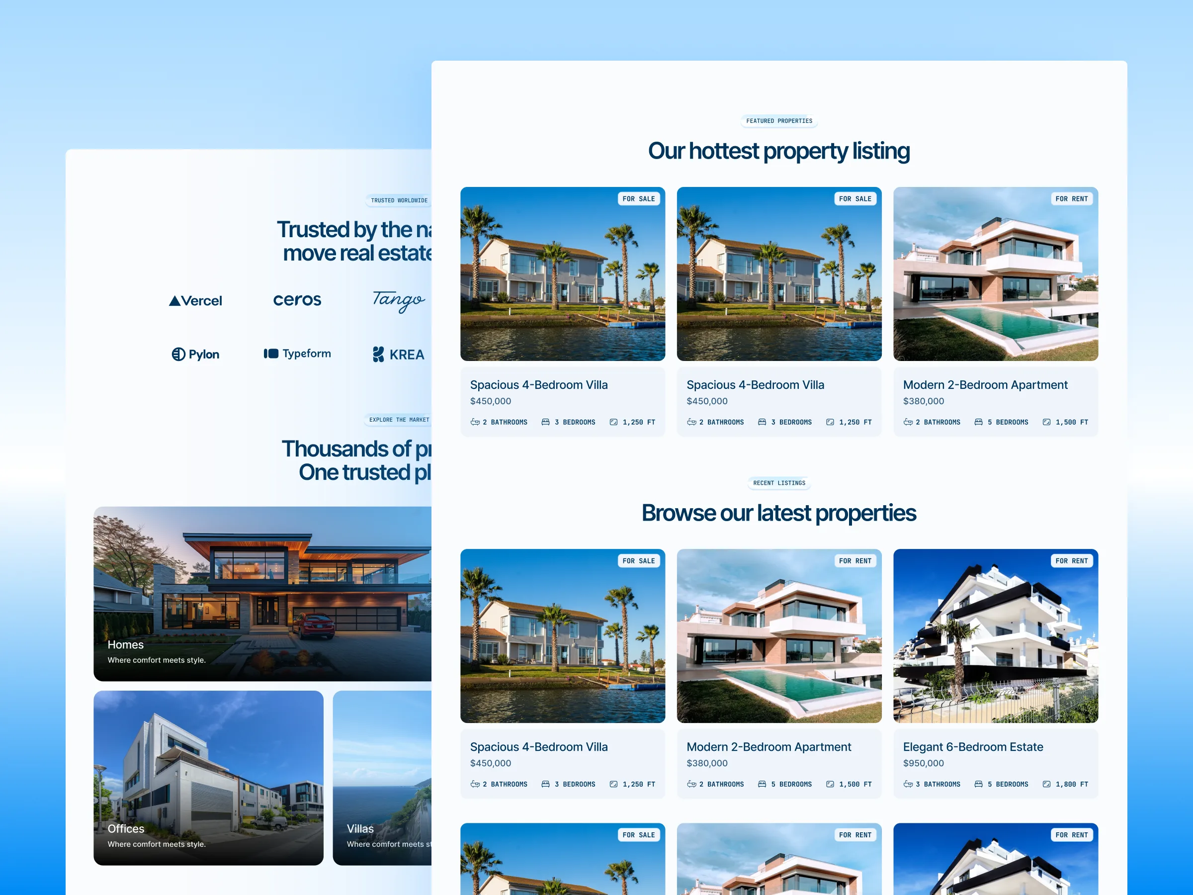 - Home – Hero, featured listings, stats, and strong calls-to-action