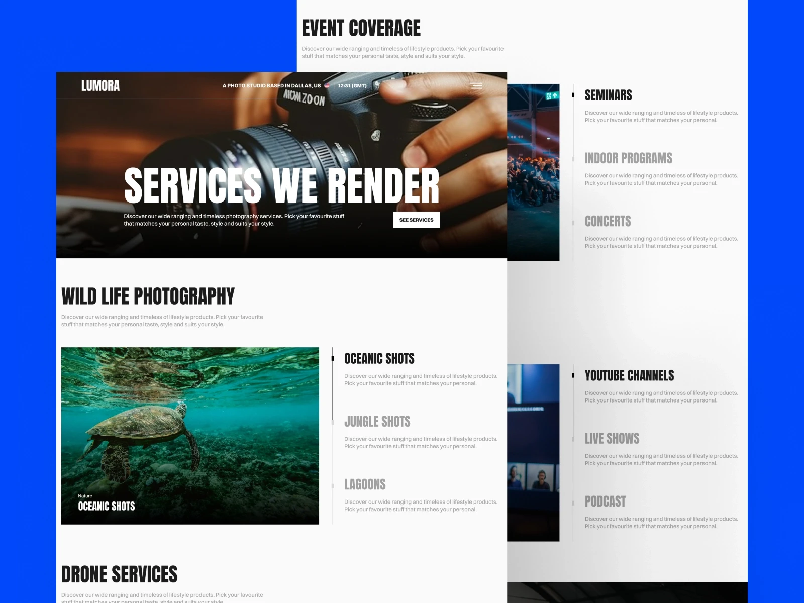 Services – Clearly present your photography offerings with categories like events, portraits, and product photography.