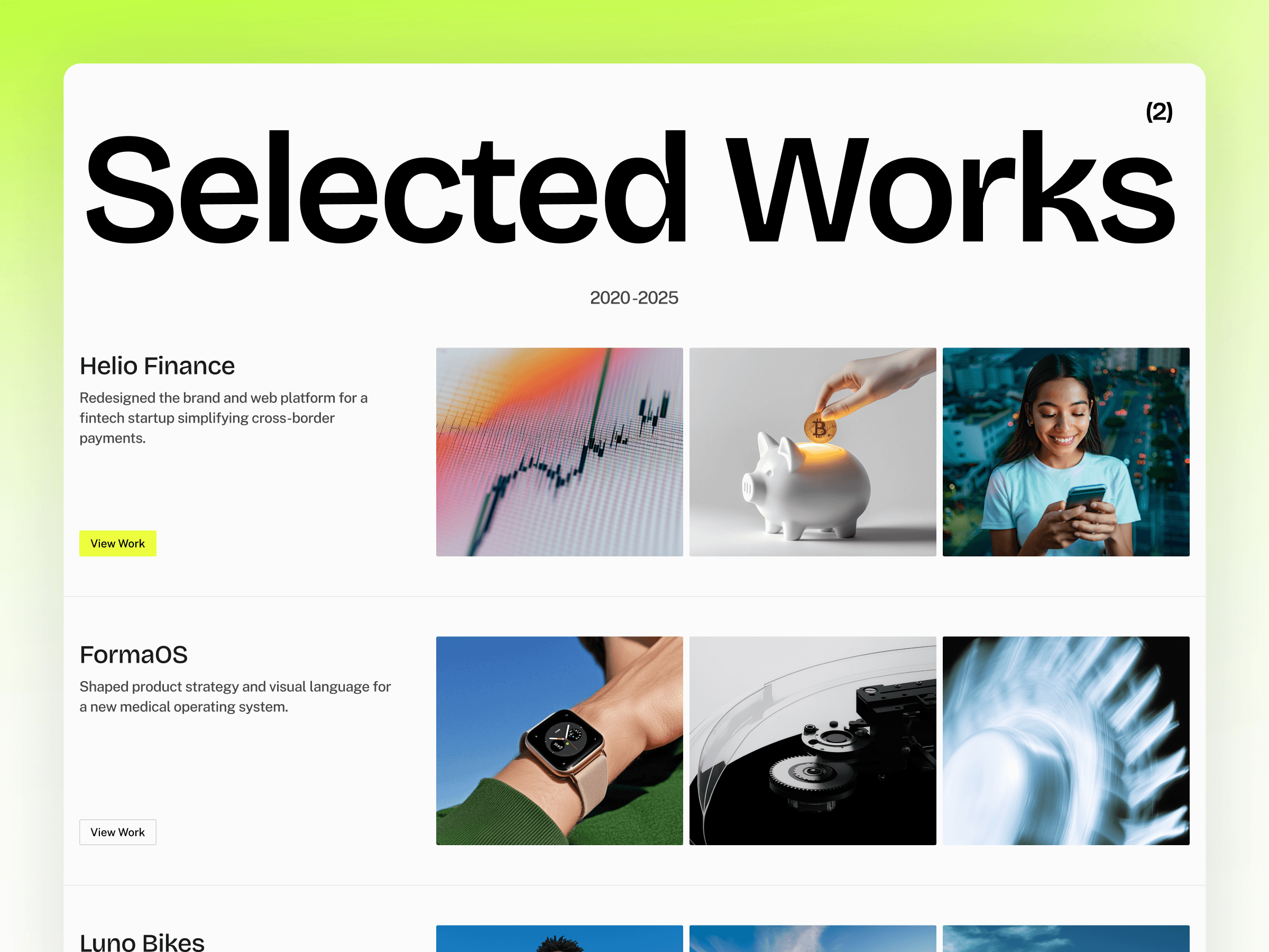 Works + Work Detail – Present featured projects with narrative depth and visual polish.