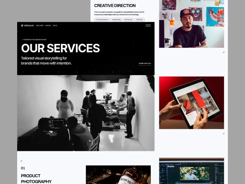 Services – Highlight offerings like product photography, creative direction, and editorial campaigns.